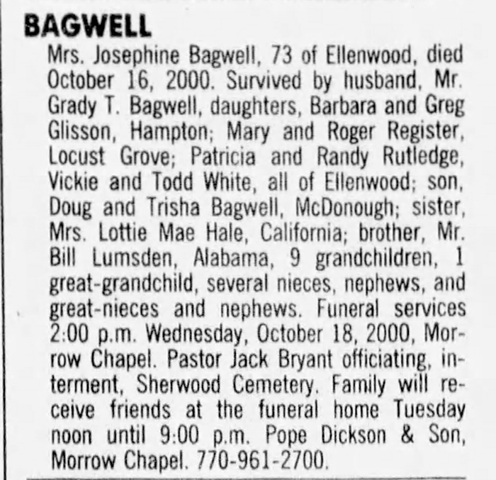 Vivian Josephine Lumsden was born on 18 October 1927 in Alabama. As of after 1950,her married name was Bagwell. She married Grady Thomas Bagwell, son of James Lee Bagwell and Mary Ellen Norwood, after 1950. Vivian Josephine Lumsden died on 16 October 2000 in Ellenwood, Georgia, at age 72. She was buried on 18 October 2000 at Sherwood Memorial Park and Mausoleum, Jonesboro, Clayton County, Georgia.