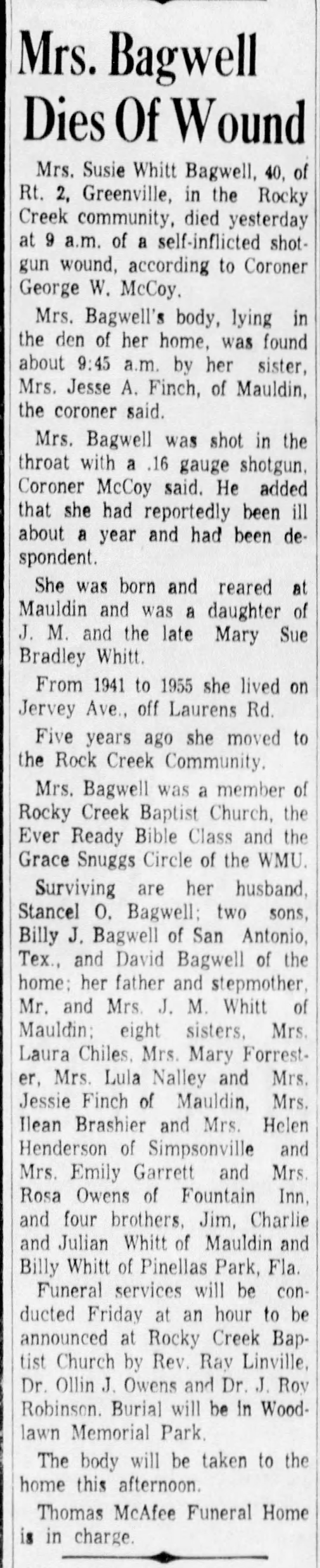 Susie Irene Whitt was born on 20 February 1919 in Mauldin, South Carolina. As of 14 August 1937,her married name was Bagwell. She married Stancel Oscar Bagwell, son of Oscar Henry Bagwell and Lillian Eva Henderson, on 14 August 1937.1 Susie Irene Whitt died on 28 September 1960 in Greenville County, South Carolina, at age 41 died of a self-inflicted, shotgun wound of the face and neck. She was buried on 30 September 1960 at Woodlawn Memorial Park, Greenville, Greenville County, South Carolina.