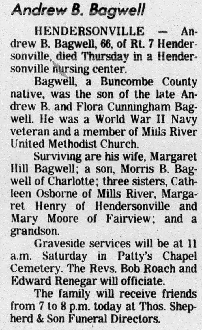 Andrew Burton Bagwell was born on 4 April 1918 in Buncombe County, North Carolina.1 He was the son of Andrew Brizille Bagwell and Flora Serepta Cunningham. Andrew Burton Bagwell lived in 1940 in Hendersonville, Henderson County, North Carolina. He worked at F. C. Shelton in 1940 at the address of 3rd Ave East, Hendersonville, Henderson County, North Carolina. He married Nina Pace on 9 February 1940 at Henderson County, North Carolina. Enlisted in the US Navy in 3 March 1942. Andrew Burton Bagwell died on 15 November 1984 in Hendersonville, Henderson County, North Carolina, at age 66.1 He was buried on 17 November 1984 at Patty Chapel Cemetery, Fletcher, Henderson County, North Carolina.1