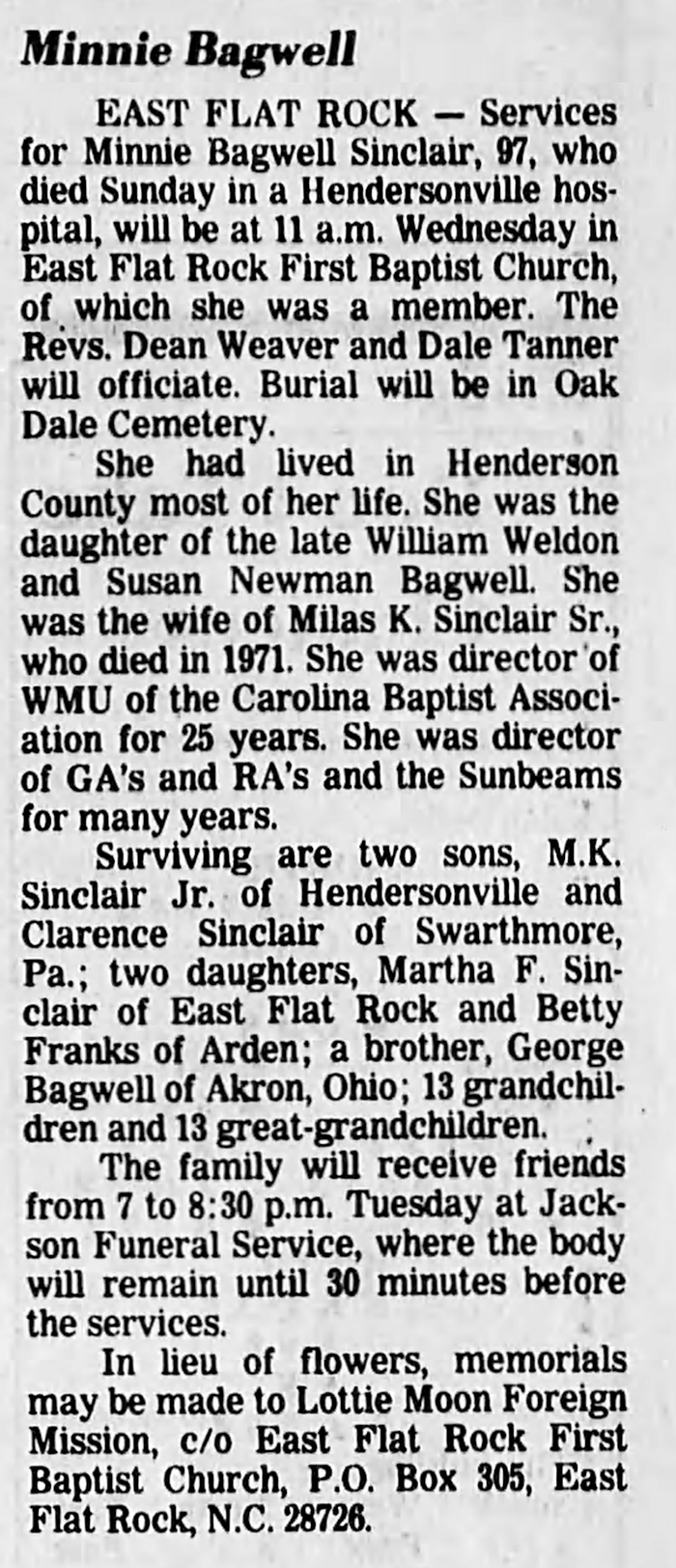 Minnie Ethel Bagwell was born on 20 October 1893 in Hendersonville, Henderson County, North Carolina.1 She was the daughter of William Weldon Bagwell and Susan Ann Newman. Her married name was Sinclair. Minnie Ethel Bagwell married Milas Kaziah Sinclair. Minnie Ethel Bagwell died on 26 November 1989 in Hendersonville, Henderson County, North Carolina, at age 96.1 She was buried on 28 November 1989 at Oakdale Cemetery, Hendersonville, Henderson County, North Carolina.1