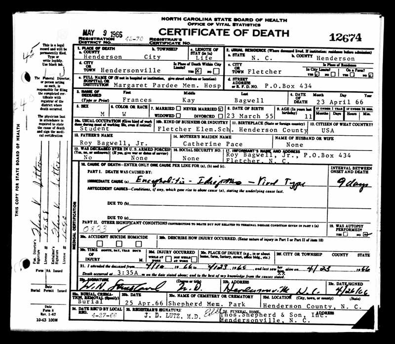 Frances Kay Bagwell was born on 23 March 1955 in Henderson County, North Carolina. She was the daughter of Roy Bagwell Jr. and Catherine Odessa Pace. Frances Kay Bagwell died on 23 April 1966 in Hendersonville, Henderson County, North Carolina, at age 11. She was buried at Shepherd Memorial Park, Naples, Henderson County, North Carolina.
