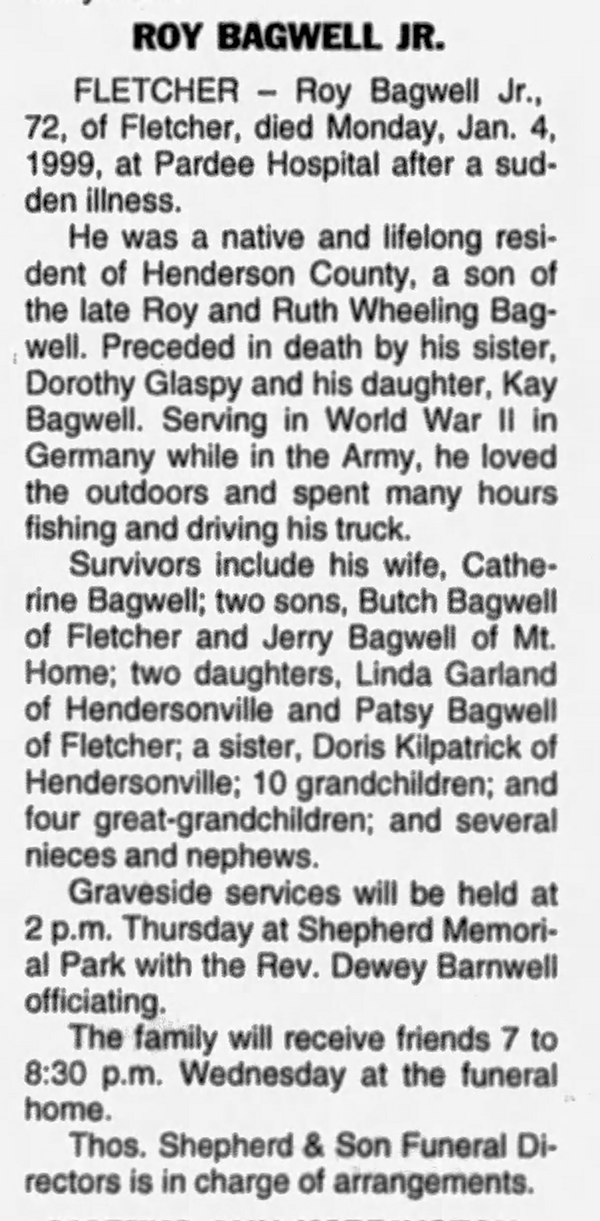 Roy Bagwell Jr. was born on 5 March 1926 in Henderson County, North Carolina. He was the son of Roy Bagwell and Ruth Wheeling. He served in the US Army in Germany during World War II. Roy Bagwell Jr. married Catherine Odessa Pace before 1949. Roy Bagwell Jr. died on 4 January 1999 in Fletcher, Henderson County, North Carolina, at age 72. He was buried on 7 January 1999 at Shepherd Memorial Park, Naples, Henderson County, North Carolina.