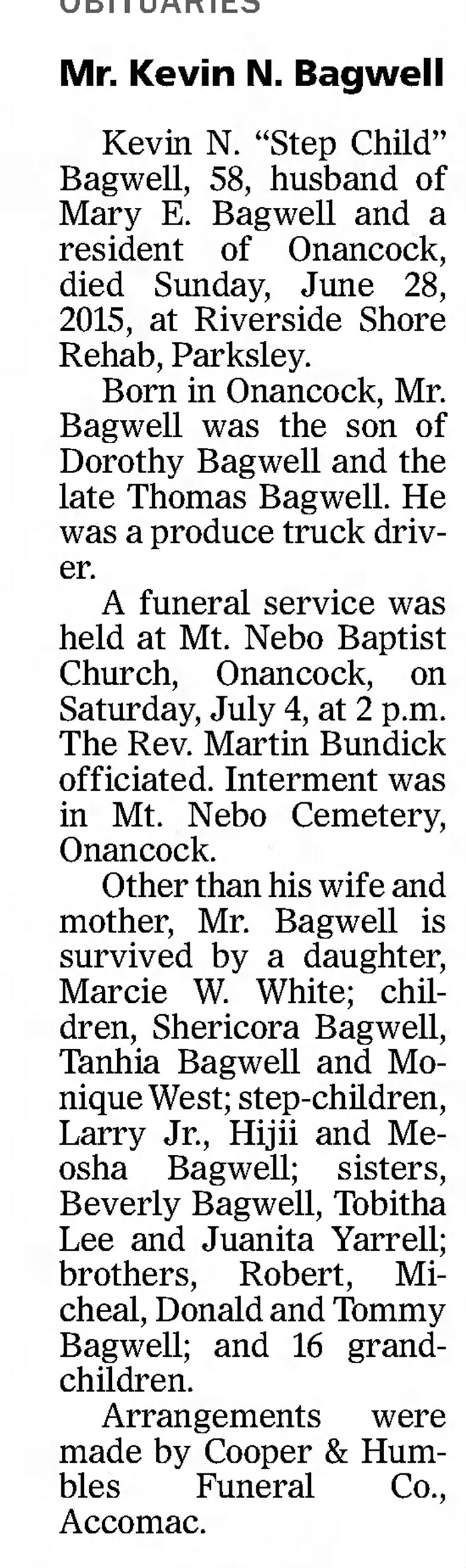 Kevin Nathaniel Bagwell was born on 21 August 1956 in Onancock, Virginia. He was the son of Thomas Nathaniel Bagwell and Dorothy Marie Finney. Kevin Nathaniel Bagwell married Connie Marie Reid on 21 August 1976. Kevin Nathaniel Bagwell and Connie Marie Reid were divorced on 6 September 1988 at Accomack County, Virginia. Kevin Nathaniel Bagwell married Mary Edwards after 1989. Kevin Nathaniel Bagwell died on 28 June 2015 in Parksley, Virginia, at age 58. He was buried on 4 July 2015 at Mt. Nebo Cemetery, Onancock, Virginia.