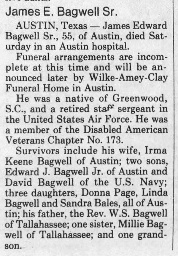 Edward Johnnie Bagwell Jr. is the son of Edward Johnnie Bagwell and Irma Belia Keene. Edward Johnnie Bagwell Jr. married Jo Lynn Perry on 14 February 1979 at Travis County, Texas.