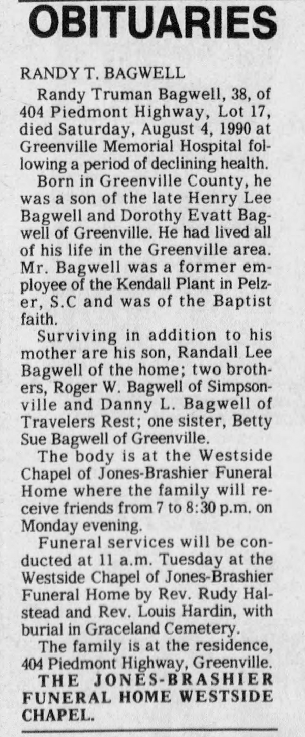 - Randall Truman Bagwell+ b. 9 Oct 1951, d. 4 Aug 1990
