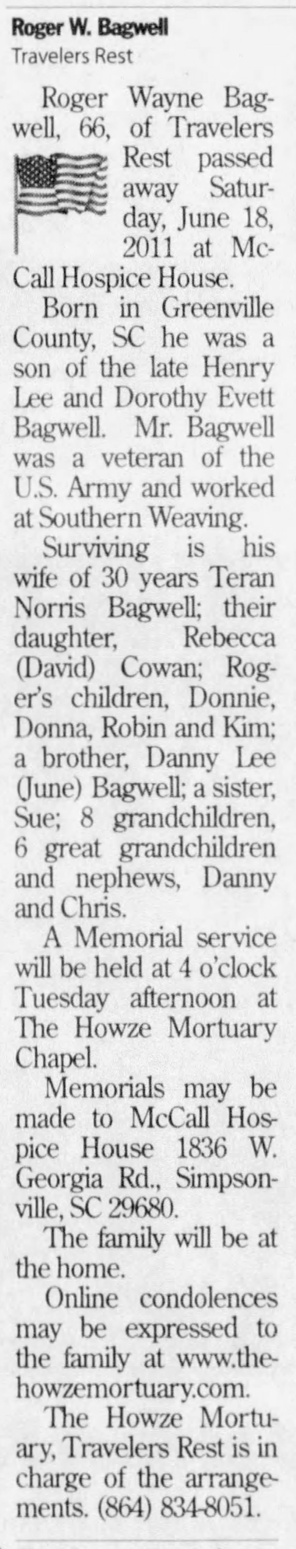 Roger Wayne Bagwell was born on 3 February 1945 in Greenville County, South Carolina. He was the son of Henry Lee Bagwell and Dorothy Lawton Evatt. Roger Wayne Bagwell married Ruth Lynn Pruitt in 1966. Roger Wayne Bagwell married Teran Sue Norris on 28 September 1984 at Greenville County, South Carolina. Roger Wayne Bagwell died on 18 June 2011 at age 66.