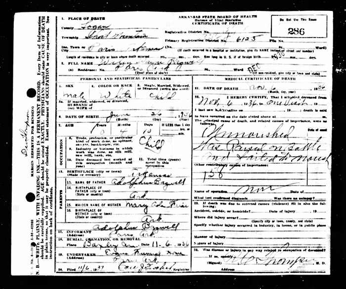 Wiley Wayne Bagwell was also known as Wallie Wayne Bagwell. He was born on 26 June 1936 in Paris, Logan County, Arkansas.1 He was the son of Adolphus Bagwell and Marietta Friar. Wiley Wayne Bagwell died on 5 November 1936 in Paris, Logan County, Arkansas.1 He was buried on 6 November 1936 at Hixson Cemetery, Paris, Logan County, Arkansas.1