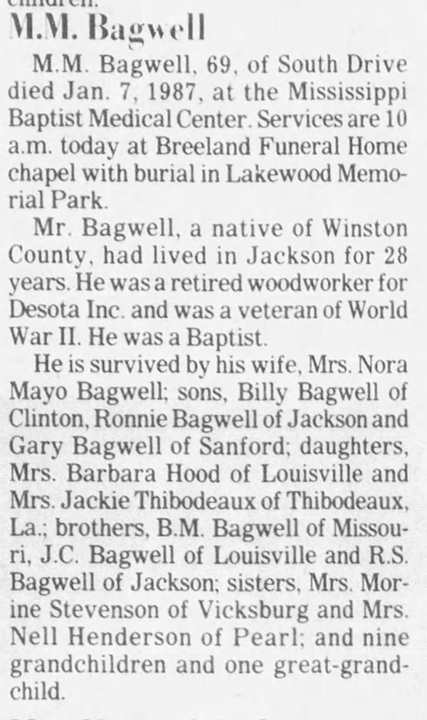 Billie I. McCool was born on 31 October 1935 in Mississippi. As of after 1953,her married name was Bagwell. She married Carvil Julius Bagwell, son of William A. Bagwell and Edna Smith, after 1953. Billie I. McCool died on 30 May 1983 in Madison, Madison County, Mississippi, at age 47. She was buried at Liberty Baptist Church Cemetery, Plattsburg, Winston County, Mississippi.