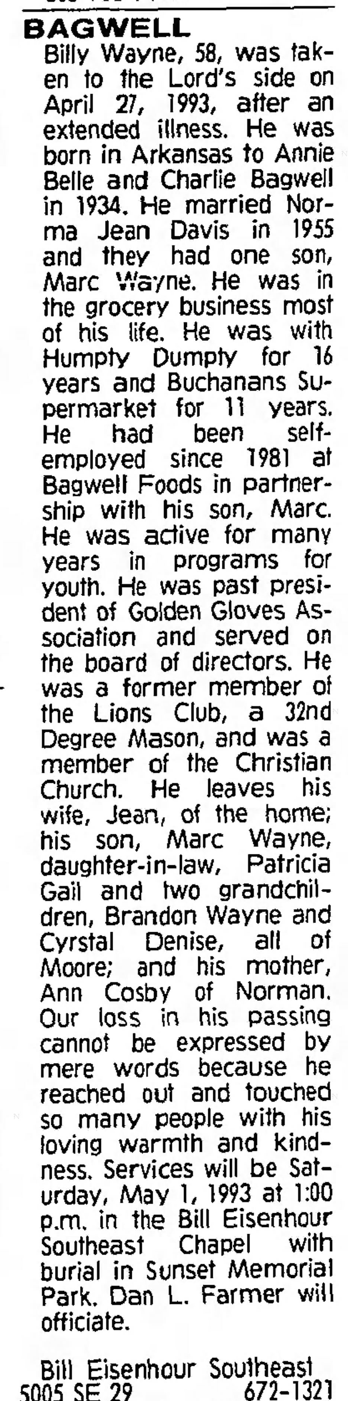 Billy Wayne Bagwell was born on 9 July 1934 in Arkansas. He was the son of Charlie Buford Bagwell and Annie Belle (?) Billy Wayne Bagwell married Norma Jean Davis on 9 August 1955 at Tulsa, Oklahoma. Billy Wayne Bagwell died on 22 April 1993 in Oklahoma City, Oklahoma, at age 58. He was buried on 1 May 1993 at Sunset Memorial Park, Norman, Cleveland County, Oklahoma.