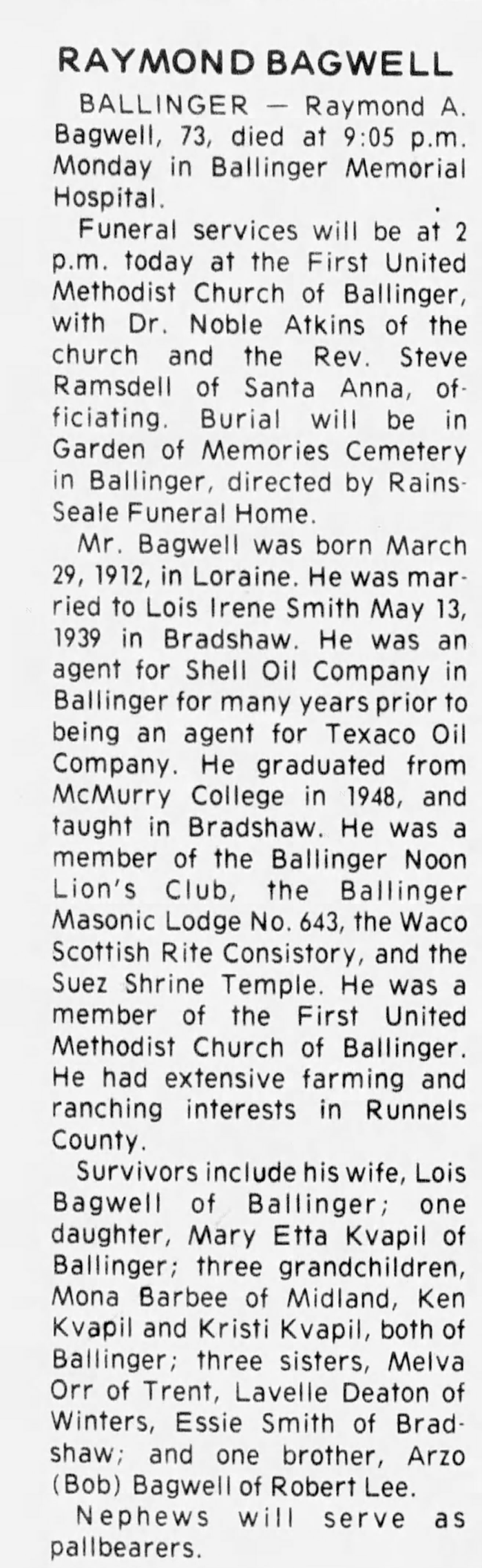 Raymond Arbie Bagwell was born on 29 March 1912 in Lorraine, Mitchell County, Texas. He was the son of Arbie Ishom Bagwell and Eddie Everline Mooty. Raymond Arbie Bagwell married Lois Irene Smith on 14 May 1938 at Irion County, Texas. Raymond Arbie Bagwell died on 24 March 1986 in Runnels County, Texas, at age 73. He was buried at Garden of Memories Cemetery, Ballinger, Runnels County, Texas.