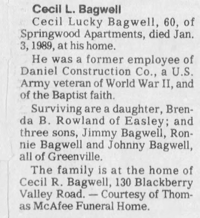 Cecil Lucky Bagwell was born on 21 February 1928 in McDowell County, North Carolina. He was the son of James Marcus Bagwell and Harlon Phillips. Cecil Lucky Bagwell married Emma Lee Womack after 1946. He served in the US Army and the US Air Force from April 29,1946 to June 1, 1954. Cecil Lucky Bagwell died on 3 January 1989 in Greenville, Greenville County, South Carolina, at age 60. He was buried at Woodlawn Memorial Park, Greenville, Greenville County, South Carolina.