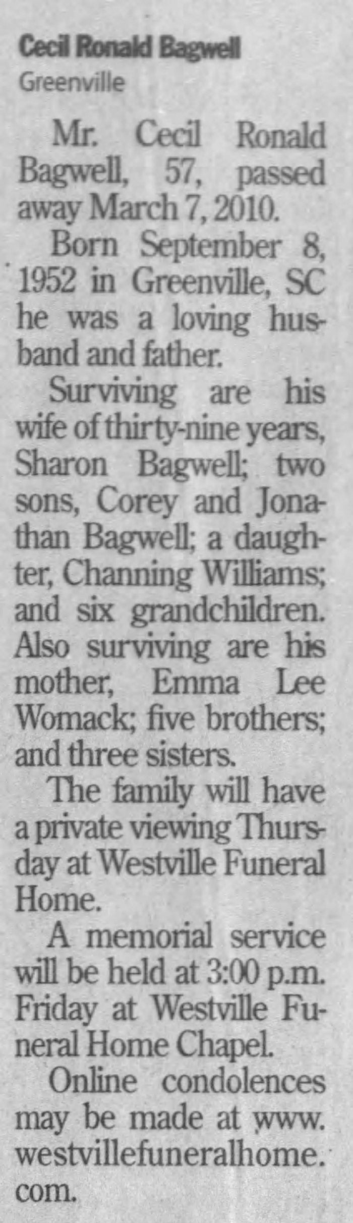 Cecil Ronald Bagwell was also known as Ronald Bagwell. He was born on 8 September 1952 in Greenville County, South Carolina. He was the son of Cecil Lucky Bagwell and Emma Lee Womble. Cecil Ronald Bagwell married Sharon Kay League after 1970 at Greenville, Greenville County, South Carolina. Cecil Ronald Bagwell died on 7 March 2010 in Greenville, Greenville County, South Carolina, at age 57.