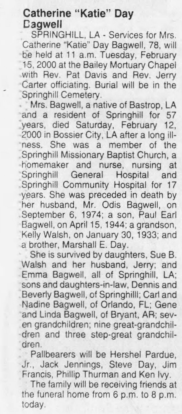 Catherine Emma Day was born on 8 March 1921 in Monroe, Ouachita Parish, Louisiana. As of 30 January 1933,her married name was Bagwell. She married Odis Thomas Bagwell, son of Delaney Hicks Bagwell and Lula M. Skains, on 30 January 1933. Catherine Emma Day died on 12 February 2000 in Bossier City, Louisiana, at age 78. She was buried on 15 February 2000 at Holmesville Baptist Church Cemetery, Union Parish, Louisiana.