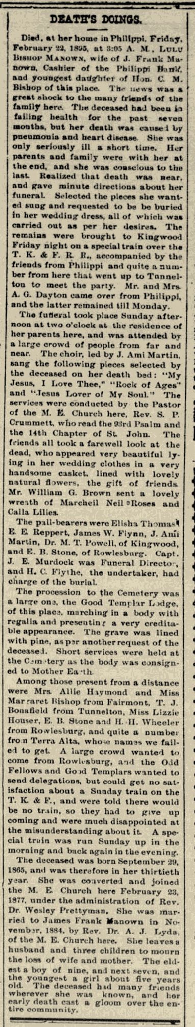 Lula Bishop was born on 29 September 1865.1 As of 1884,her married name was Manown. She married James Franklin Manown, son of James Harvey Manown and Mary Isabella Armstrong, in 1884 at Preston County, West Virginia. Lula Bishop died on 22 February 1895 in Philippi, Barbour County, West Virginia, at age 29.1 She was buried at Maplewood Cemetery, Kingwood, Preston County, West Virginia.1