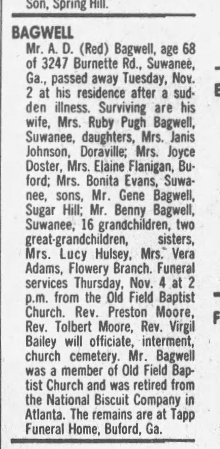 Albert Dempsey "Red" Bagwell was born on 20 September 1914 in Cumming, Forsyth County, Georgia.1 He was the son of Emory Lafayette Bagwell and Loudelia Faggans.1 Albert Dempsey "Red" Bagwell married Ruby Mae Pugh on 3 November 1935 at Hall County, Georgia.2 Albert Dempsey "Red" Bagwell died on 2 November 1982 in Suwanee, Gwinnett County, Georgia, at age 68 Obit: Services for A. D. (Red) Bagwell, 68, 3247 Burnette Road, Suwanee, were to be held at 2 pm Thursday at Old Field Baptist Church with the Revs. Preston Moore, Tolbert Moore, and Virgil Bailey officiating. Mr. Bagwell, who died at his residence after a sudden illness, was retired from the National Biscuit Co. in Atlanta. He was a member of Old Field Bapt. Church. Survivors include his wife, Ruby Pugh Bagwell; daughters, Janis Johnson, Joyce Doster, Elaine Flanigan, and Bonita Evans; sons, Gene Bagwell and Benny Bagwell; 16 grandchildren and two great grandchildren; sisters, Lucy Hulsey and Vera Adams.1 He was buried at Peachtree Road Baptist Church Cemetery, Lawrenceville, Gwinnett County, Georgia.1