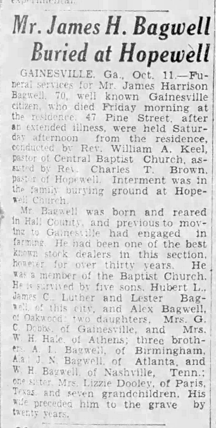 James Harrison Bagwell was born on 26 September 1860 in Gainesville, Hall County, Georgia.1,2 He was the son of William Bagwell and Martha A. Blackstock.2,1 James Harrison Bagwell married Lula Hope on 8 November 1885 at Hall County, Georgia. James Harrison Bagwell married Nancy Ada Cheek before 1890. James Harrison Bagwell died on 10 October 1930 in Gainesville, Hall County, Georgia, at age 70. He was buried on 11 October 1930 at Hopewell Baptist Church Cemetery, Gainesville, Hall County, Georgia.