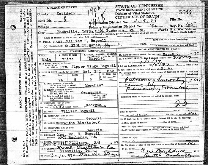 Most of the above is from his Death Certificate, with Mrs William H Bagwell of 2301 Buchanan Street as the informant.2 He was buried on 8 March 1937 at Spring Hill Cemetery, Nashville, Davidson County, Tennessee.2
