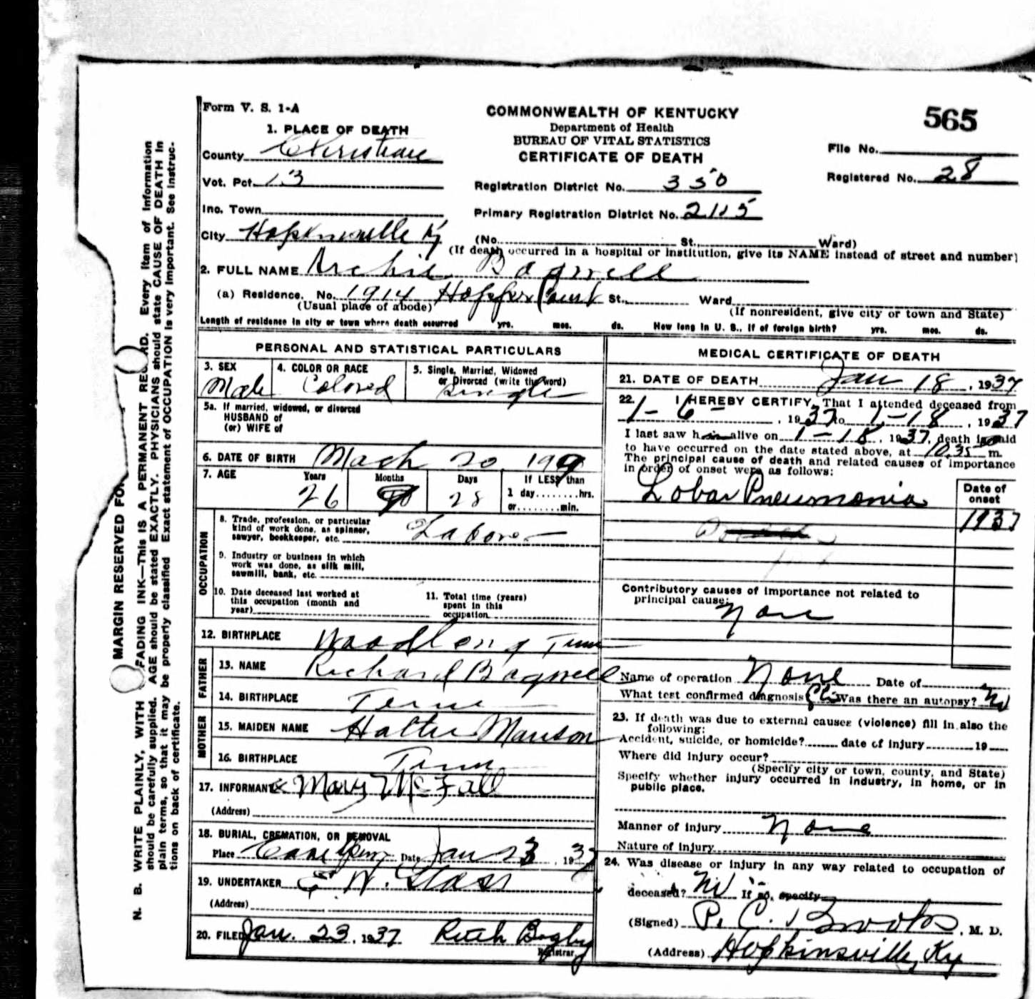 Archie Richard Bagwell was born on 20 March 1909 in Woodlawn, Tennessee. He was the son of Richard Bagwell and Hattie Manson. Archie Richard Bagwell died on 18 January 1937 in Hopkinsville, Christian County, Kentucky, at age 27.