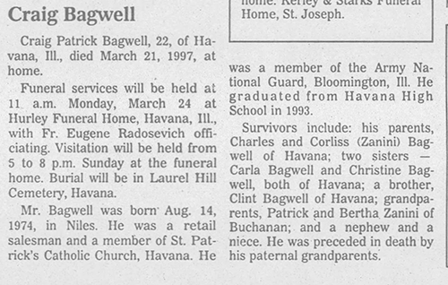 - Craig Patrick Bagwell b. 14 Aug 1974, d. 21 Mar 1997
