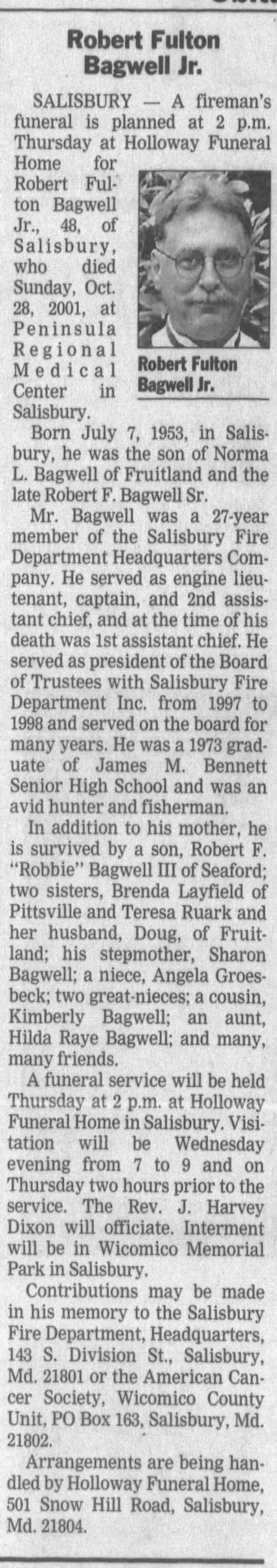 Robert Fulton Bagwell Jr. was born on 7 July 1953 in Salisbury, Wicomico County, Maryland. He was the son of Robert Fulton Bagwell Sr. and Norma Lee Williams. Robert Fulton Bagwell Jr. married Sondra Ann Conaway on 20 September 1986 at Seaford, Delaware. Robert Fulton Bagwell Jr. died on 28 October 2001 in Salisbury, Wicomico County, Maryland, at age 48. He was buried on 1 November 2001 at Wicomico Memorial Park, Salisbury, Wicomico County, Maryland.