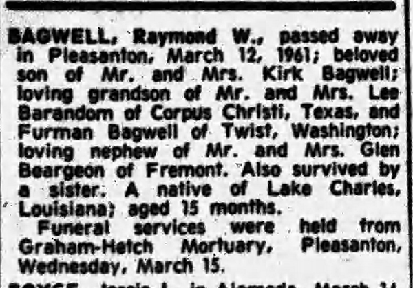 Raymond Wayne Bagwell was born on 7 December 1959 in Louisiana.1 He was the son of Kirk Joseph Bagwell and Jeanette Lee Brandon.1 Raymond Wayne Bagwell died on 12 March 1961 in Pleasanton, Alameda County, California, at age 1.1 He was buried on 15 March 1961 at Wenatchee City Cemetery, Wenatchee, Chelan County, Washington.1