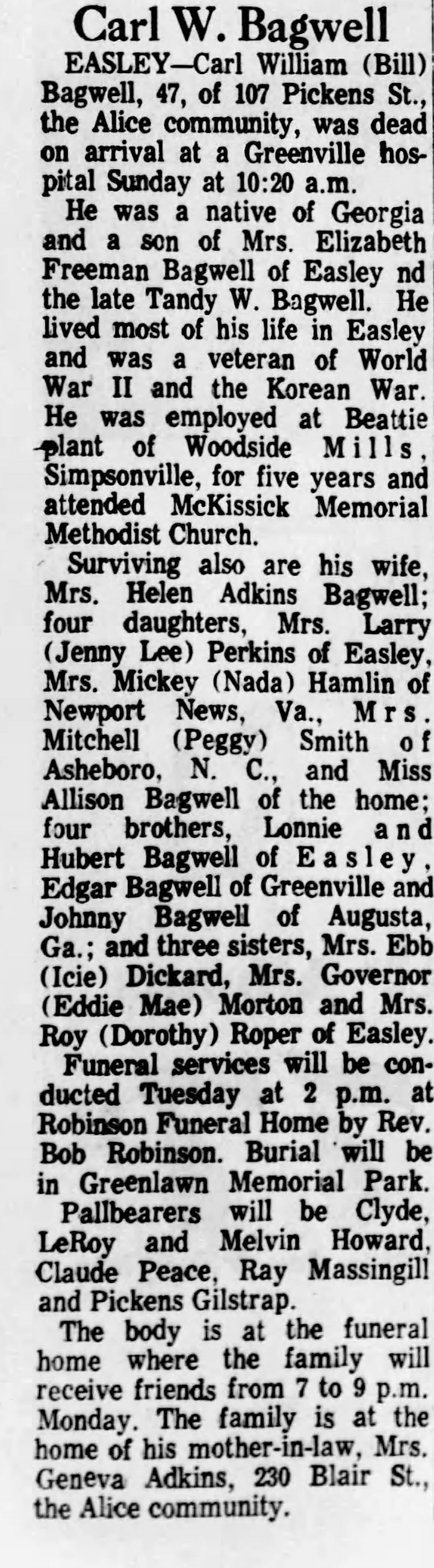 Carl William Bagwell was also known as William Carl Bagwell. He was born on 29 April 1920 in Carnesville, Georgia. He was the son of Tandy Walker Bagwell and Elizabeth Della Freeman. He was a veteran of World War II and the Korean War. Carl William Bagwell married Helen Louise Adkins before 1947. Carl William Bagwell died on 24 December 1967 in Greenville, Greenville County, South Carolina, at age 47. He was buried on 26 December 1967 at Greenlawn Memorial Park, Easley, Pickens County, South Carolina.
