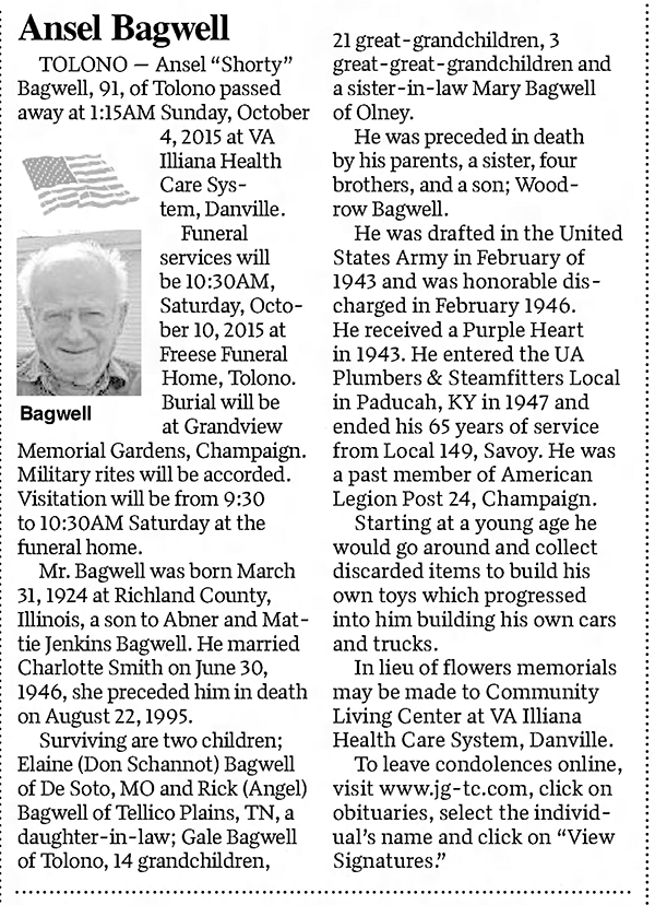 Ansel Guy Bagwell was born on 31 March 1924 in Richland County, Illinois. He was the son of Abner Guy Bagwell and Mattie Jenkins. Ansel Guy Bagwell married Charlotte M. Smith on 30 June 1946. Ansel Guy Bagwell died on 4 October 2015 in Veterans Affairs Illiana Health Care System, Danville, Illinois, at age 91 TOLONO – Ansel "Shorty" Bagwell, 91, of Tolono passed away at 1:15 a.m. Sunday (Oct. 4, 2015) at Veterans Affairs Illiana Health Care System, Danville.