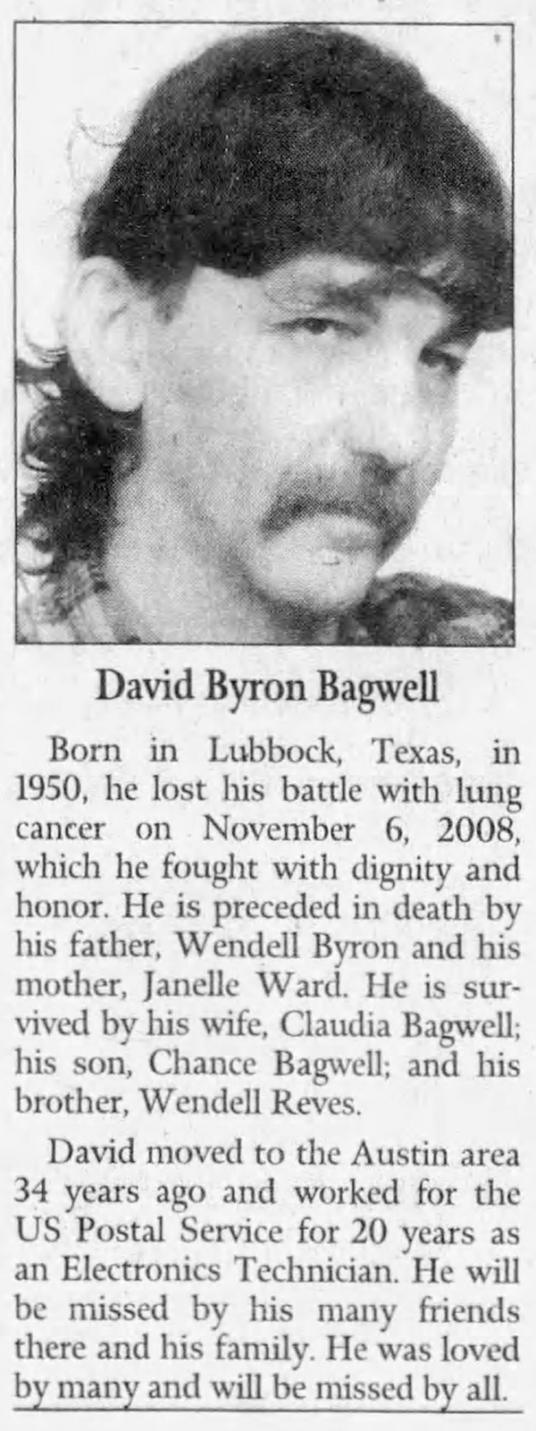 David Byron Bagwell was born on 10 June 1950 in Lubbock, Texas. He was the son of Wendall Reves Bagwell and Jeanelle Halford. David Byron Bagwell married Melinda Kay Parker on 10 July 1971 at Lynn County, Texas. David Byron Bagwell and Melinda Kay Parker were divorced on 1 November 1974. David Byron Bagwell married Renne Claudia Urquidi on 31 October 1989 at Travis County, Texas. David Byron Bagwell died on 6 November 2008 at age 58.