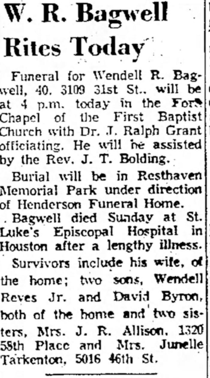 Wendall Reves Bagwell was born on 18 December 1925 in Los Angeles County, California. He was the son of Joy Reaves Bagwell and Mattye Graves Blacklock. Wendall Reves Bagwell married Jeanelle Halford in 1947 at Eddy, New Mexico. Wendall Reves Bagwell died on 4 December 1966 in Harris County, Texas, at age 40. He was buried on 6 December 1966 at Resthaven Memorial Park, Lubbock, Lubbock County, Texas.