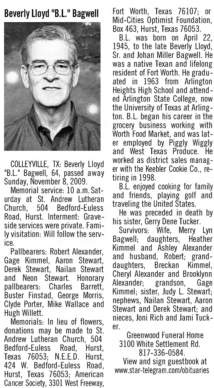 - Gerry Dene Bagwell b. 17 Aug 1937, d. 12 May 1973