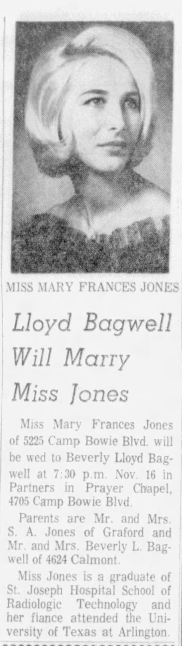 Beverly Lloyd Bagwell & Mary Frances Jones - Marriage Annoucement