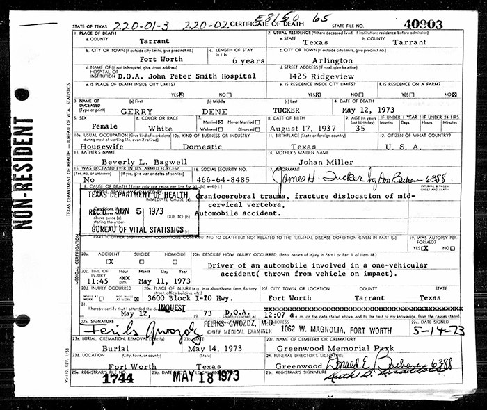 Gerry Dene Bagwell was born on 17 August 1937 in Tarrant County, Texas. She was the daughter of Beverly Lloyd Bagwell and Lena Johan Miller. As of 13 June 1953,her married name was Tucker. Gerry Dene Bagwell married James Hudson Tucker on 13 June 1953 at Tarrant County, Texas. Gerry Dene Bagwell died on 12 May 1973 in Forest Hill, Tarrant County, Texas, at age 35 from injuries of an automobile accident. She was buried on 14 May 1973 at Greenwood Memorial Park and Mausoleum, Forth Worth, Tarrant County, Texas.