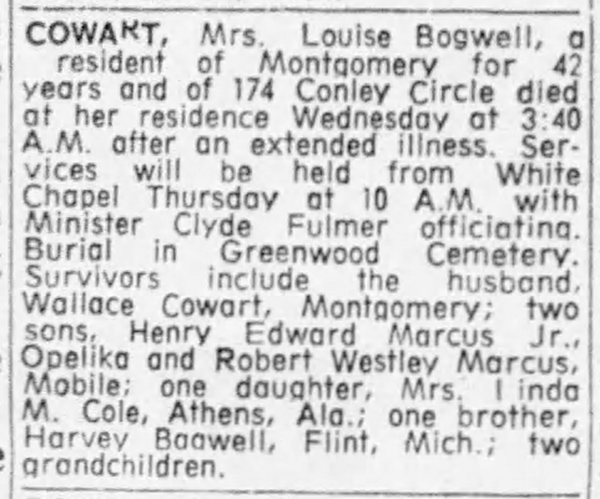 Louise Thelma (Bagwell) (Marcus) Cowart - Obituary