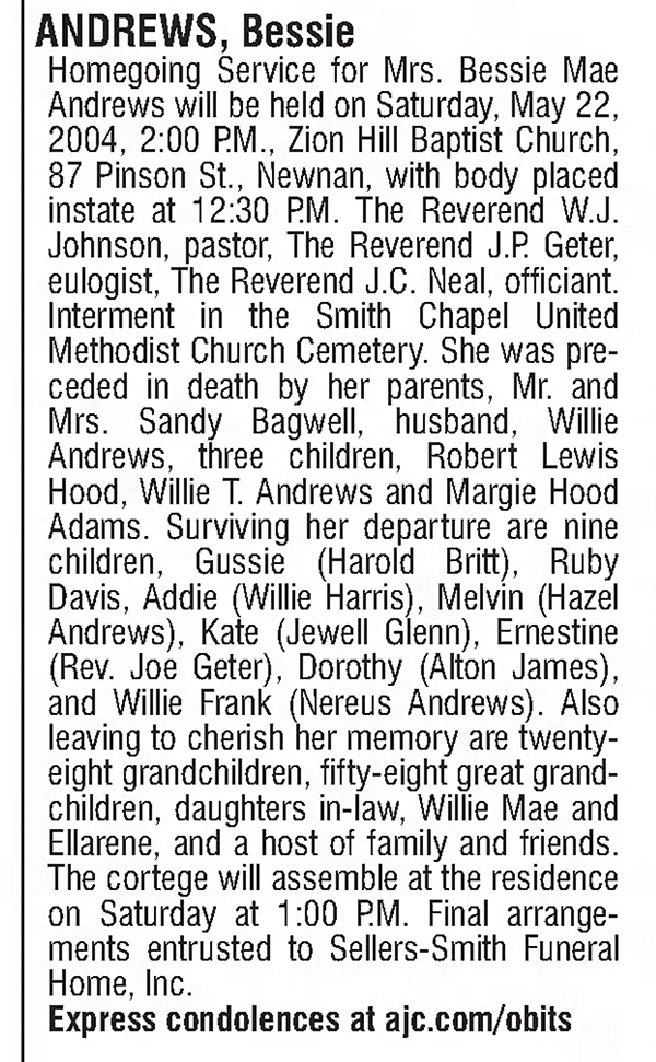 Bessie Mae (Bagwell) (Adams) Andrews - Obituary