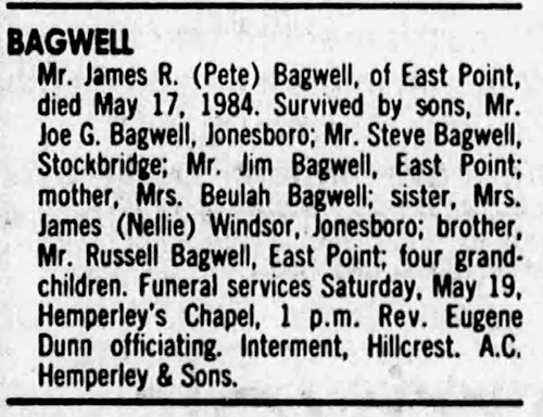 William Russell Bagwell was born on 19 April 1920 in East Point, Georgia.1 He was the son of James Sterling Bagwell and Beulah Mae Brown. William Russell Bagwell died on 25 February 1995 at age 74. He was buried on 27 February 1995 at Hillcrest Cemetery, East Point, Fulton County, Georgia.