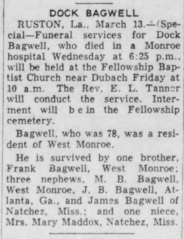 RUSTON, La., March 13 - (Special) -- Funeral services for Dock Bagwell, who died in a Monroe hospital Wednesday at 6:25 pm, will be held at the Fellowship Baptist Church near Dubach Friday at 10 am. The Rev. E. L. Tanner will conduct the service. Interment will be in the Fellowship Cemetery. Bagwell, who as 78, was a resident of West Monroe.