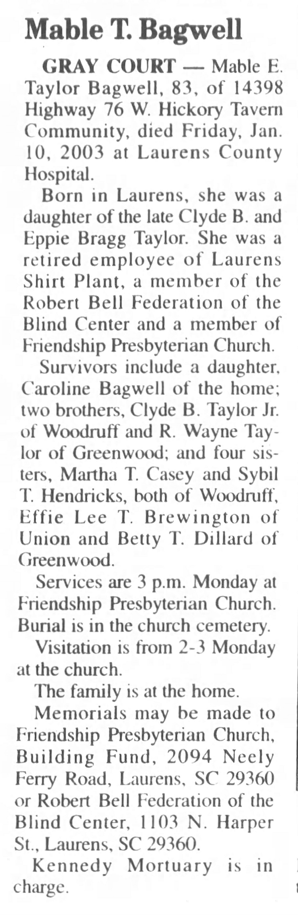 Mable Carolina Bagwell was born on 6 September 1940. She was the daughter of Claude Robert Bagwell and Mable Evelyn Taylor. Mable Carolina Bagwell died on 8 December 2018 in Laurens, South Carolina, at age 78. She was buried at Friendship Presbyterian Church Cemetery, Hickory Tavern, Laurens County, South Carolina.