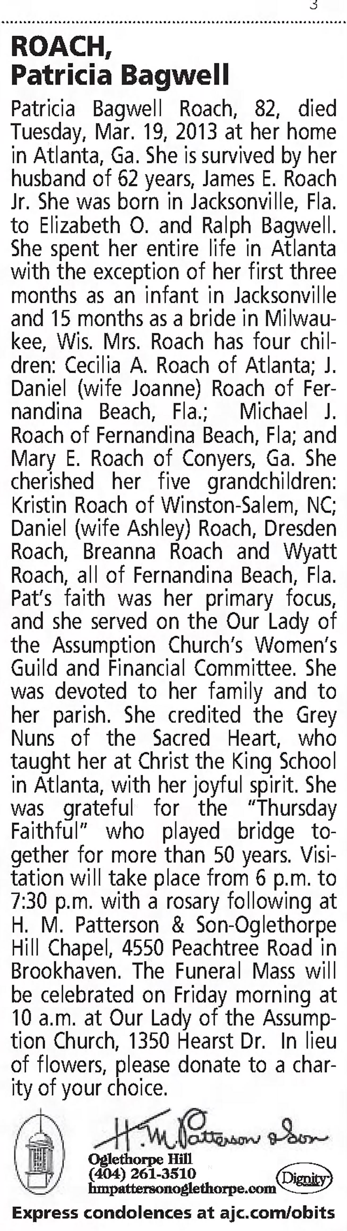 Patricia Bullard Bagwell was born on 26 March 1930 in Jacksonville, Florida. She was the daughter of Ralph Willard Bagwell and Elizabeth O. (?) As of May 1952,her married name was Roach. Patricia Bullard Bagwell married James Emmett Roach in May 1952. Patricia Bullard Bagwell died on 19 March 2013 in Atlanta, Georgia, at age 82. She was buried on 22 March 2013 at Arlington Memorial Park, Sandy Springs, Fulton County, Georgia.