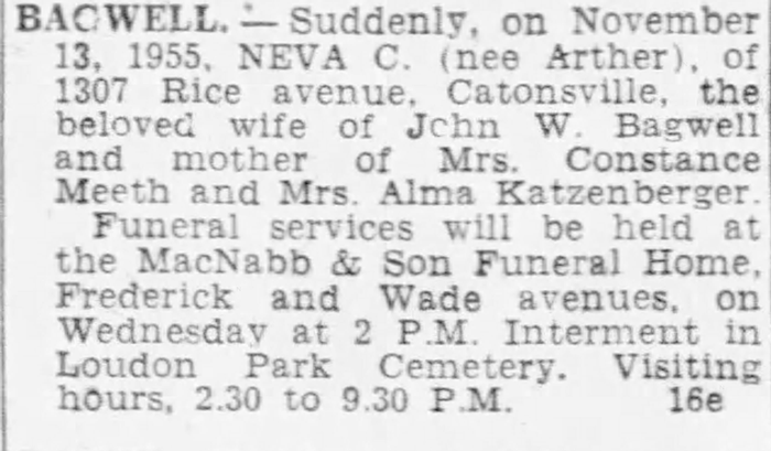 Neva Constance Arther was born in 1882 in Maryland. As of 7 September 1904,her married name was Bagwell. She married John Watson Bagwell, son of William Healy Bagwell and Susan Elizabeth Watson, on 7 September 1904 at Fulton Avenue Baptist Church, Baltimore, Maryland. Neva Constance Arther died on 13 November 1955 in Catonville, Maryland. She was buried on 16 November 1955 at Loudon Park Cemetery, Baltimore, Baltimore City, Maryland.