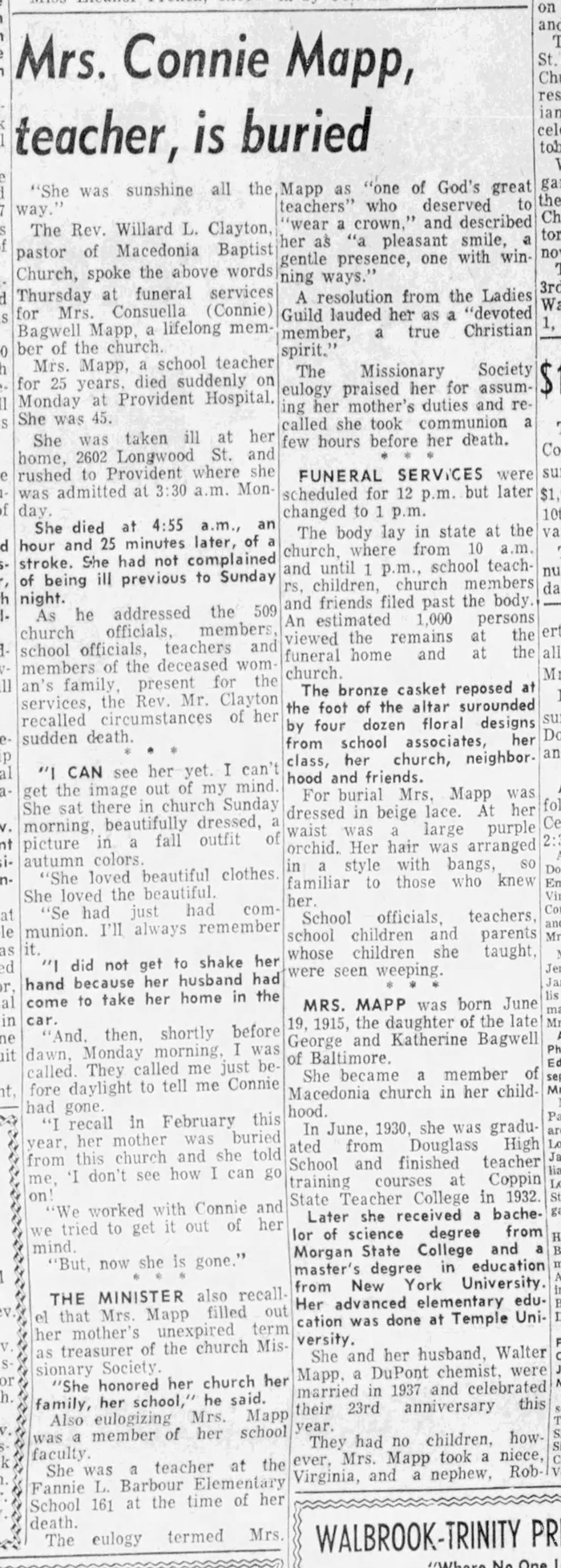 Consuelo Bagwell was born on 19 June 1914 in Maryland. She was the daughter of George Washington Bagwell and Catherine Robinson. As of 1937,her married name was Mapp. Consuelo Bagwell married Walter Mack Mapp in 1937 at New Jersey. Consuelo Bagwell died on 10 October 1960 in Provident Hospital, Baltimore, Maryland, at age 46. She was buried at Baltimore National Cemetery, Baltimore, Baltimore City, Maryland.