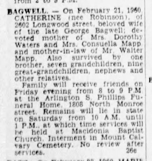Consuelo Bagwell was born on 19 June 1914 in Maryland. She was the daughter of George Washington Bagwell and Catherine Robinson. As of 1937,her married name was Mapp. Consuelo Bagwell married Walter Mack Mapp in 1937 at New Jersey. Consuelo Bagwell died on 10 October 1960 at age 46. She was buried at Baltimore National Cemetery, Baltimore, Baltimore City, Maryland.