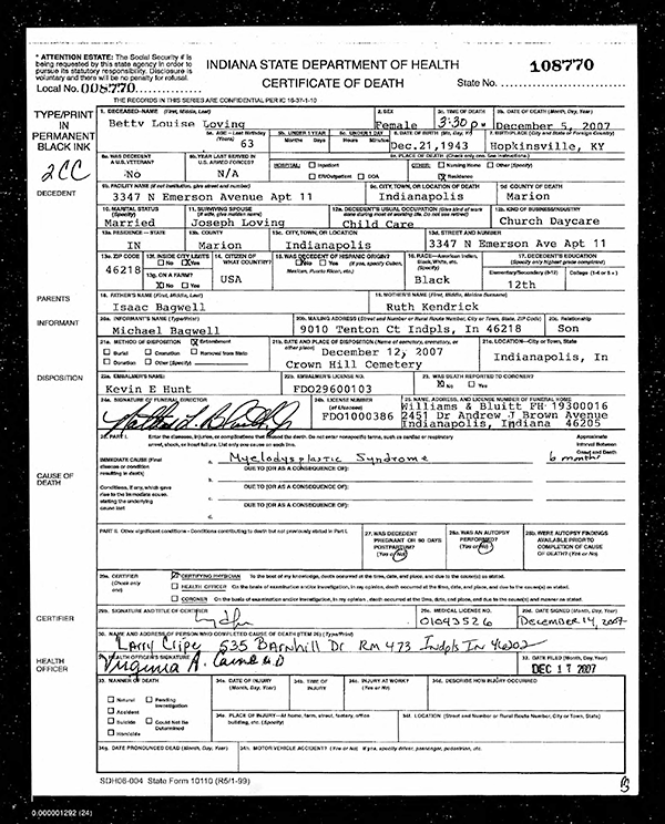 Betty Louise Bagwell was born on 21 December 1943 in Hopkinsville, Kentucky.1 She was the daughter of Isaac Bagwell and Ruth Kendrick. As of 2 April 1977,her married name was Loving. Betty Louise Bagwell married Joseph Loving on 2 April 1977 at Indianapolis, Marion County, Indiana. Betty Louise Bagwell died on 5 December 2007 in Indianapolis, Marion County, Indiana, at age 63.1 She was buried on 12 December 2007 at Crown Hill Cemetery, Indianapolis, Marion County, Indiana.1