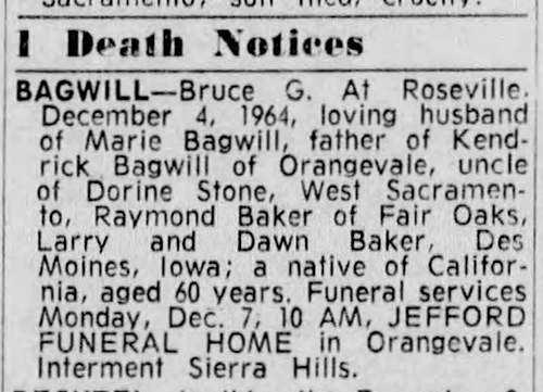 Donald Bruce Bagwill was born on 1 May 1927 in Fresno County, California. He was the son of Bruce Glenwood Bagwill and Irene Hazel Francis. Donald Bruce Bagwill married Modestin Smith before 1951. Donald Bruce Bagwill and Modestin Smith were divorced in September 1972 at Alameda City, California. Donald Bruce Bagwill married Merle L. Wood on 11 May 1975 at Los Angeles, California. Donald Bruce Bagwill died on 25 January 2004 in Sacramento, Sacrmento County, California, at age 76. He was buried at Sierra Hills Memorial Park, Sacramento, Sacrmento County, California.
