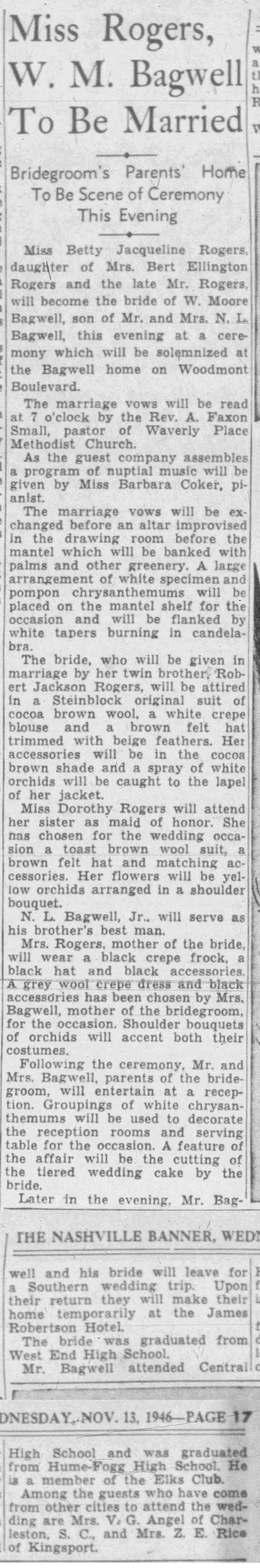 Walter Moore Bagwell and Betty Rogers - Wedding Annoucement