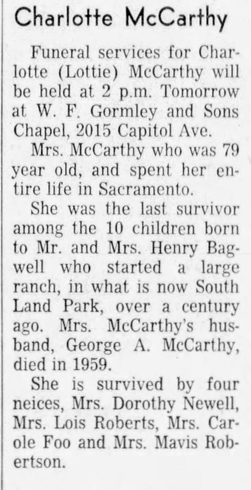 George Andrew McCarthy was born on 29 October 1891 in Sacramento, Sacrmento County, California. He married Charlotte M. Bagwill, daughter of Henry Bryant Bagwell and Rosa Etta Newkirk, before 1930. George Andrew McCarthy died on 4 June 1959 in Sacramento, Sacrmento County, California, at age 67. He was buried at East Lawn Memorial Park, Sacramento, Sacrmento County, California.