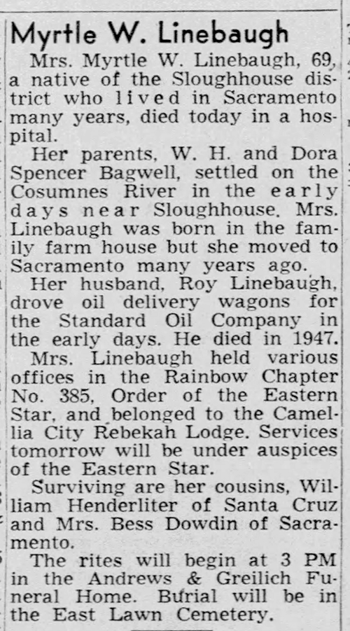 Pearl Roy Linebaugh married Myrtle Willa Bagwill, daughter of William Henry Bagwill and Dora E. Spencer, on 8 October 1903 at Sacramento, Sacrmento County, California.