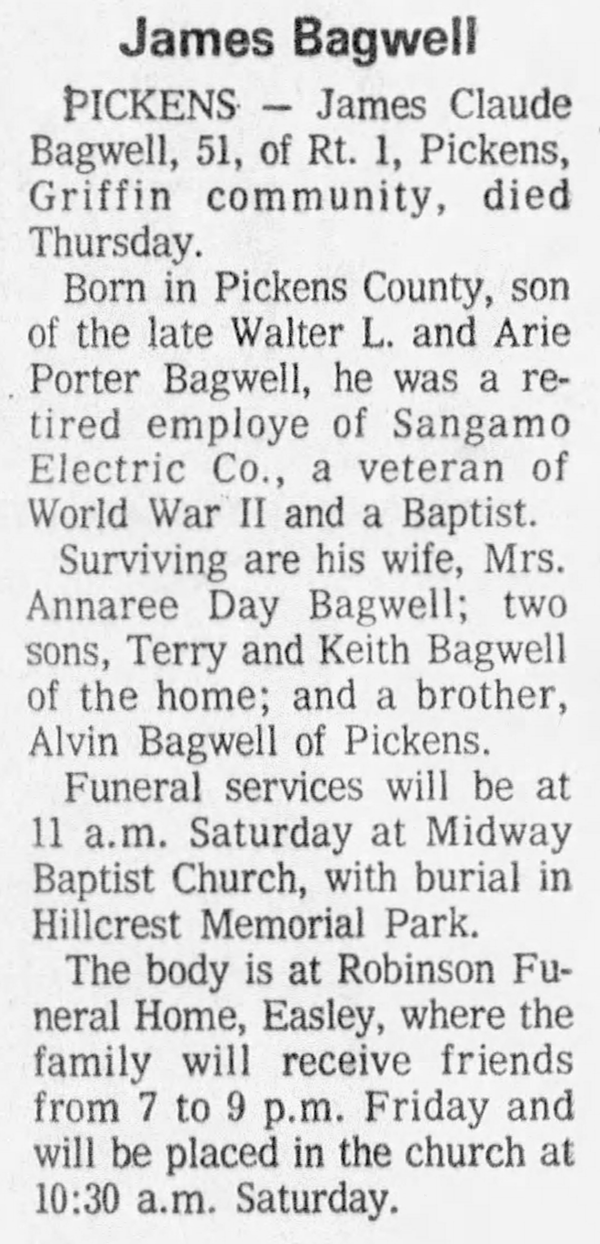 James Claude Bagwell was born on 28 September 1922 in Pickens County, South Carolina. He was the son of Walter Lee Bagwell and Ara Jane Porter. He served in the US Army from from 11 December 1942 to 2 November 1945 during World War II. James Claude Bagwell married Susan Annaree Day after 1945. James Claude Bagwell died on 25 July 1974 at age 51. He was buried on 27 July 1974 at Hillcrest Memorial Park, Pickens, Pickens County, South Carolina.