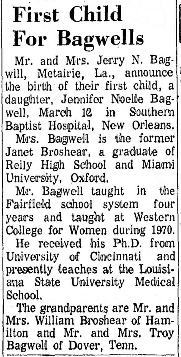 Janet Broshear married Dr. Jerry Neal Bagwell, son of Troy Virgil Bagwell and Gerline Savannah Vaughan, circa 1965.