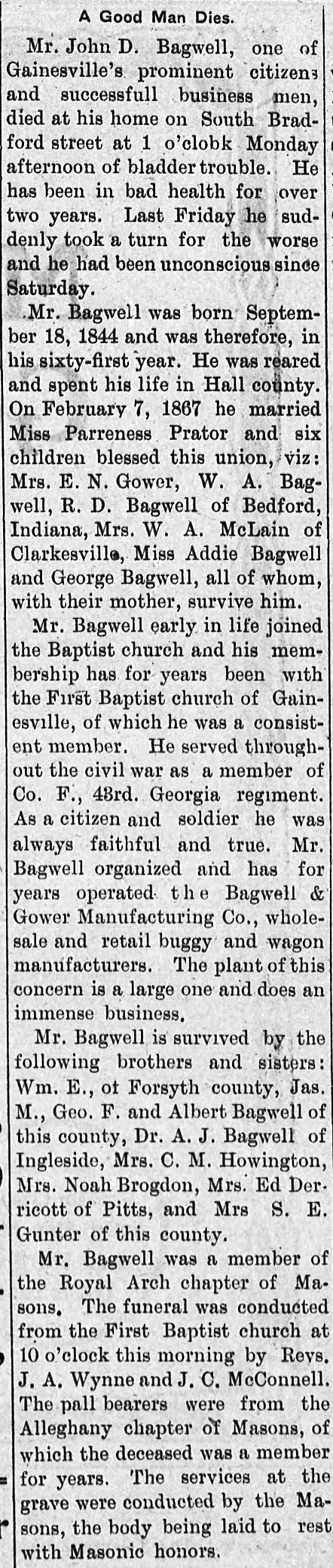 Bagwell’s sons, Berry and Bob, continued the business until the final wagon was built in 1952 for K. H. Graham. Bagwell’s wagons were sold nationwide and in one brochure they said their wagons were available in “one grade only, the best.” The Bagwell’s are buried in Alta Vista Cemetery. John Daniel Bagwell married Parreness Ann Prather on 7 February 1867 at Hall County, Georgia. John Daniel Bagwell died on 7 July 1905 in Gainesville, Hall County, Georgia, at age 60.1 He was buried at Alta Vista Cemetery, Gainesville, Hall County, Georgia.1
