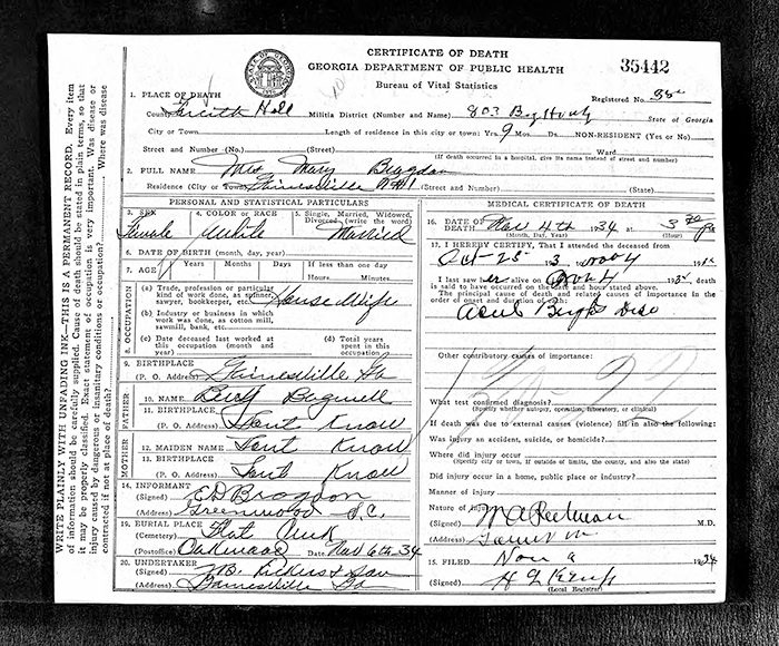 Beulah Bagwell was born in 1887 in Georgia. She was the daughter of George Franklin Bagwell and Emma C. (Mary) Rice. Beulah Bagwell died in 1919 in Flowery Branch, Hall County, Georgia.